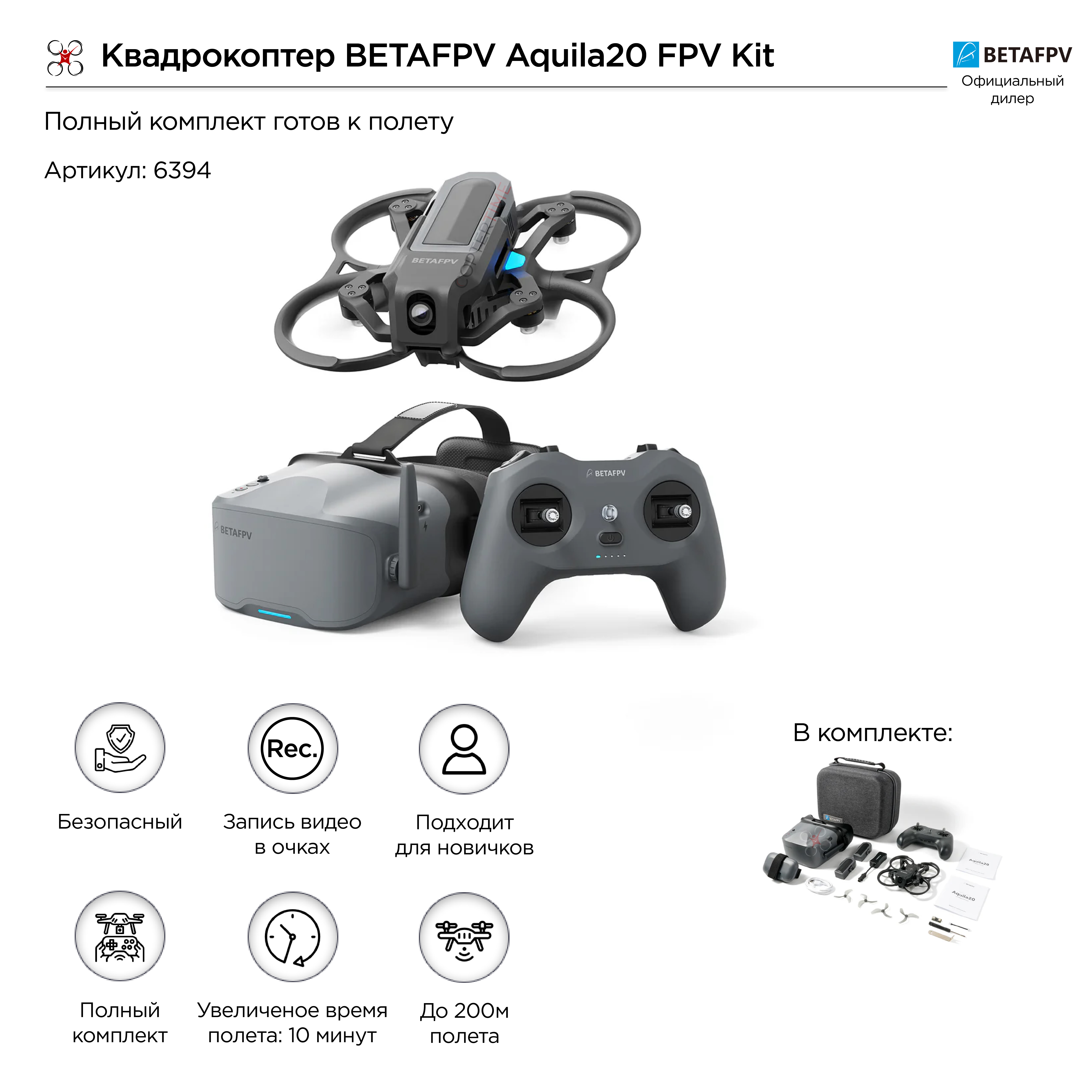 | Как купить | Чтобы купить Квадрокоптер BETAFPV Aquila20 FPV Kit по цене 49990 рублей, нажмите на кнопку в корзину и оформите заказ на странице оформления заказа или вы можете заказать товар в один клик. |