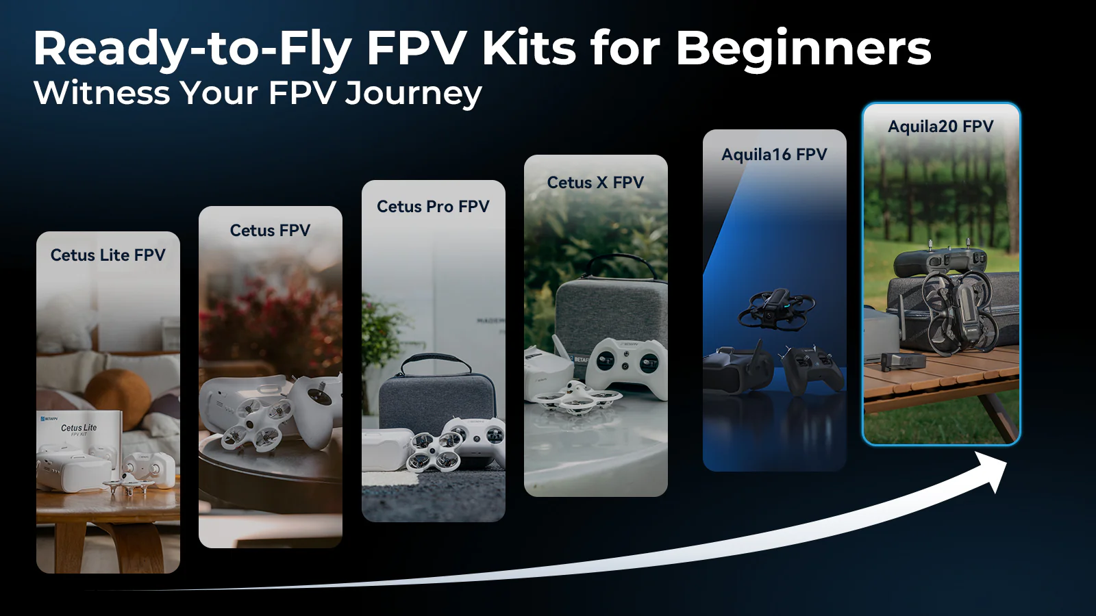 Начиная с Cetus Lite (с 2021 года) и заканчивая новым комплектом Aquila20 FPV, BETAFPV постоянно совершенствует свои готовые к полету FPV-комплекты, чтобы удовлетворить потребности пилотов на каждом этапе. Инновации, ориентированные на производительность, долговечность и простоту использования, позволяют нашей серии предлагать первоклассные варианты, разработанные как для начинающих, так и для профессионалов, гарантируя, что каждый сможет уверенно и контролируемо испытать острые ощущения от полета.