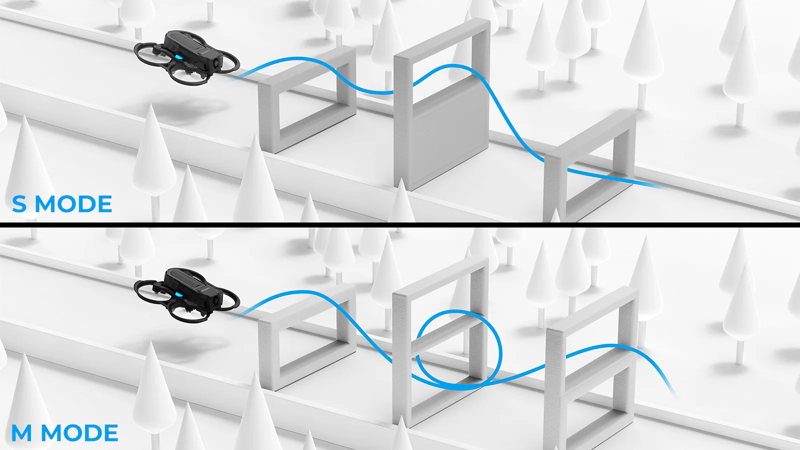 Для тех, кто готов к продвижению по карьерной лестнице. Режимы S и M отключают все вспомогательные функции, предоставляя опытным пилотам полный, ничем не ограниченный контроль при выполнении переворотов, бочек и точных маневров.
