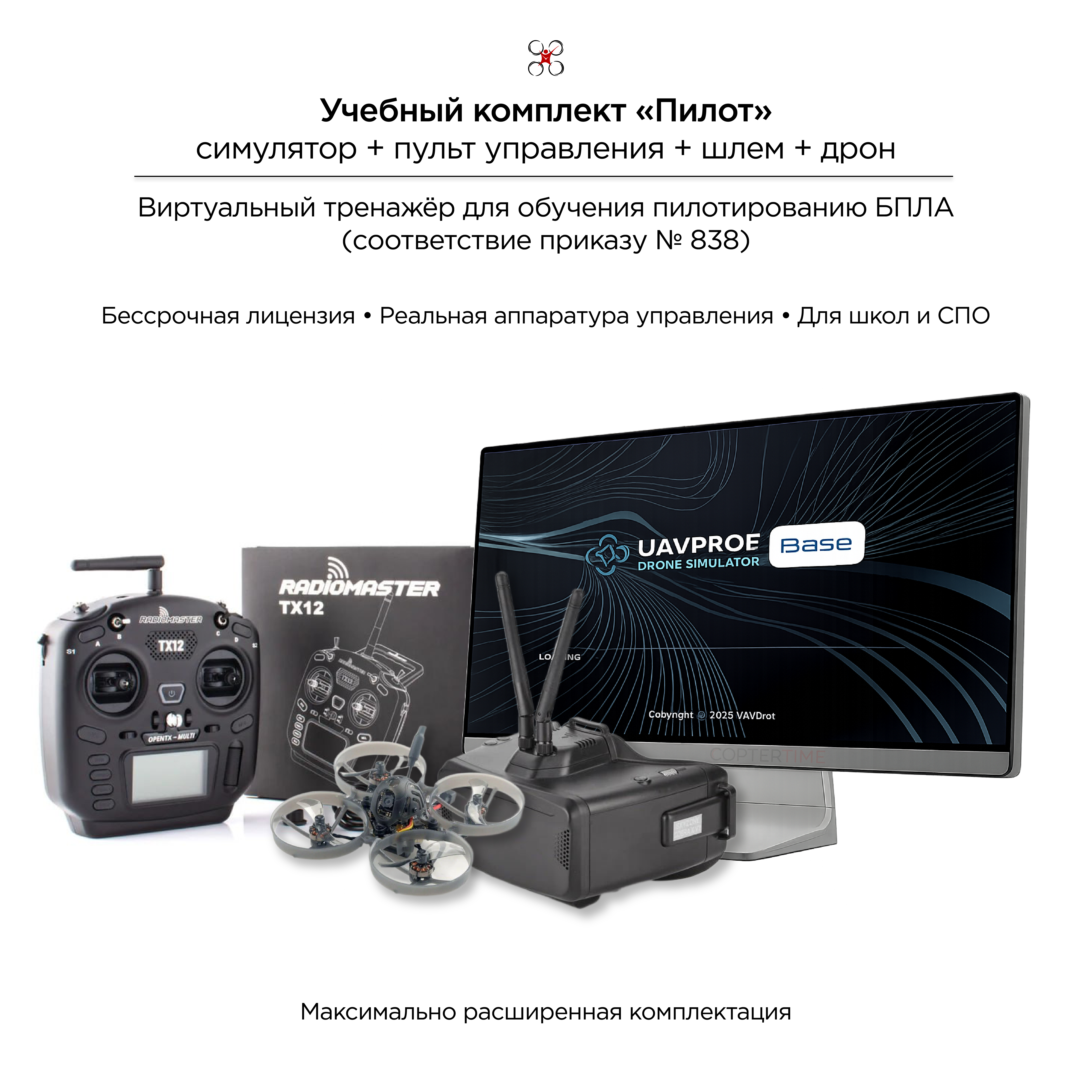 Мы работаем с дронами и беспилотными технологиями с 2012 года и подбираем учебные комплексы с учётом реальных условий эксплуатации в школах и учебных центрах. Такой набор позволяет выстроить системное обучение — от симулятора до реального полёта — в одном решении.